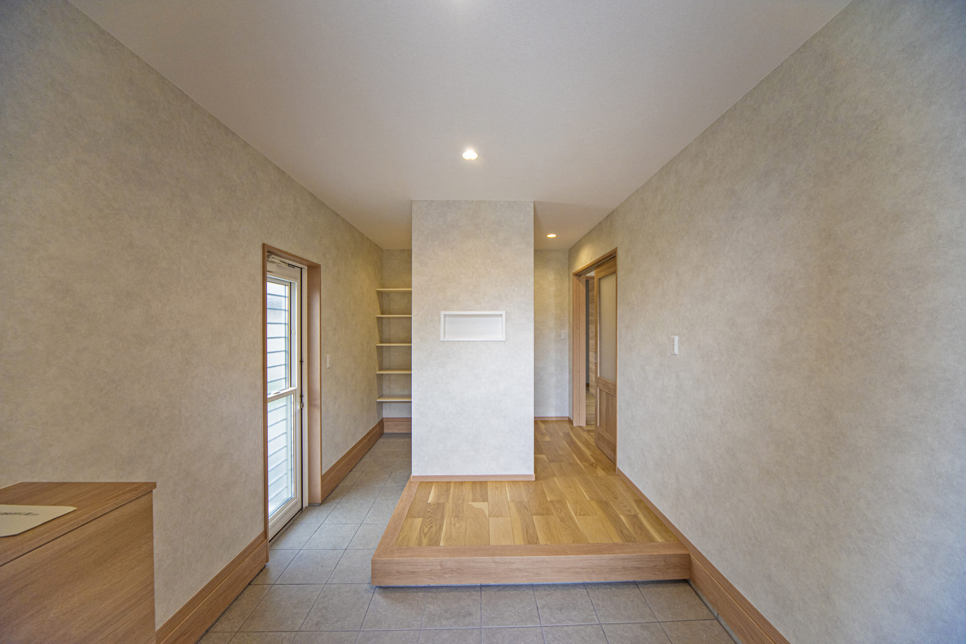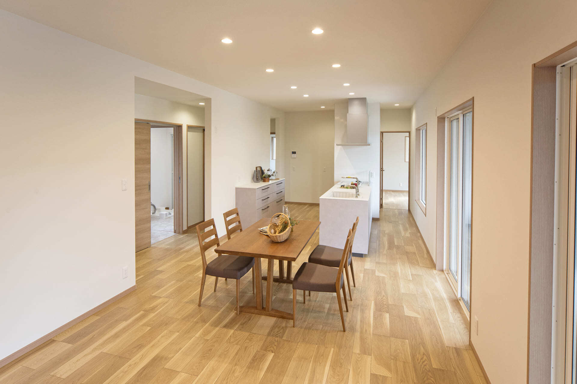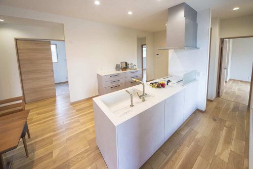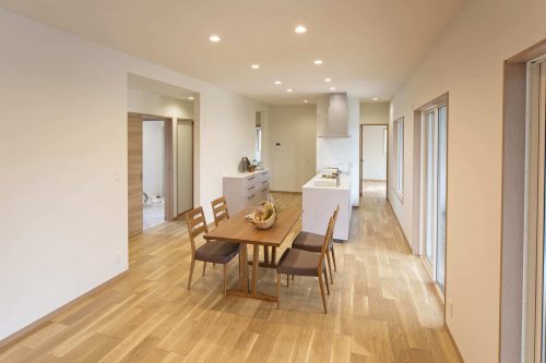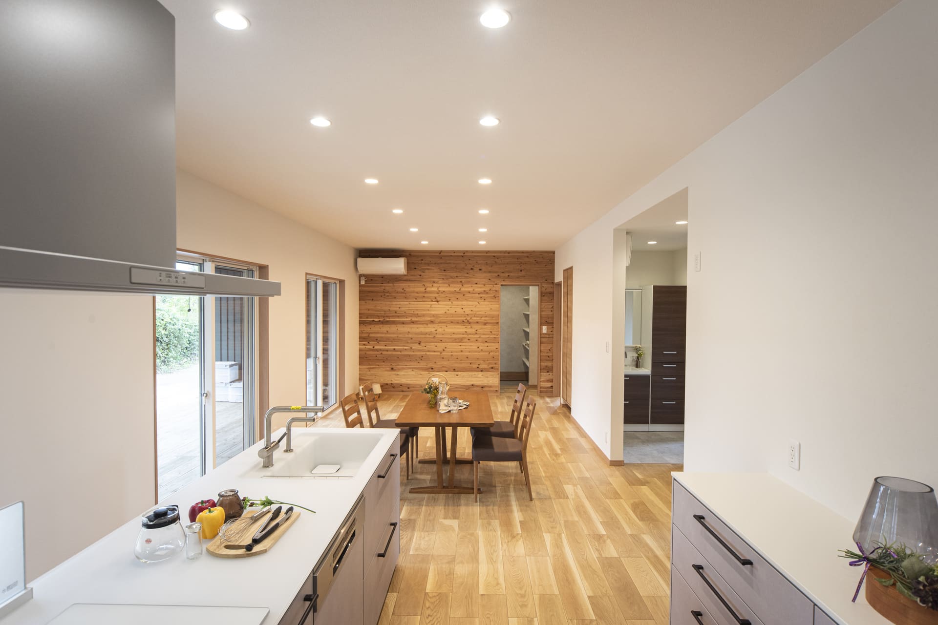 家族の笑顔があふれる住まい 出水市 T様邸 注文住宅/ 平屋 2025.01.20 広々としたリビングに暖かい日差しが降り注ぎ、木目のアクセントウォールが上質な空気を演出。家族みんながくつろげる、開放的な空間が広がります。 家事の負担を軽減するBOSCH食洗機や、豊富な収納スペースを備えた玄関など、日々の暮らしを快適にする工夫も満載。 ウッドデッキでは、バーベキューや読書など、様々なアウトドアリビングを楽しめます。自然を感じながら、家族との時間を深めることができます。